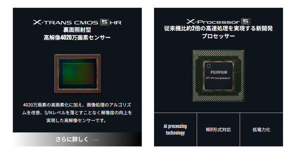 センサーは、裏面照射型約4020万画素「X-Trans CMOS 5 HR」、画像処理エンジンは「X-Processor 5」を搭載。新しい画素構造の採用により、従来機では拡張感度だったISO125を常用感度として使用可能。電子シャッターのシャッタースピードは最速1/18万秒に設定でき、明るい環境下でも絞り開放での撮影が行える。