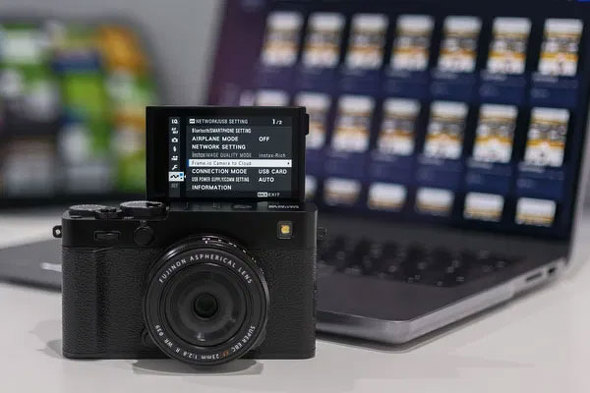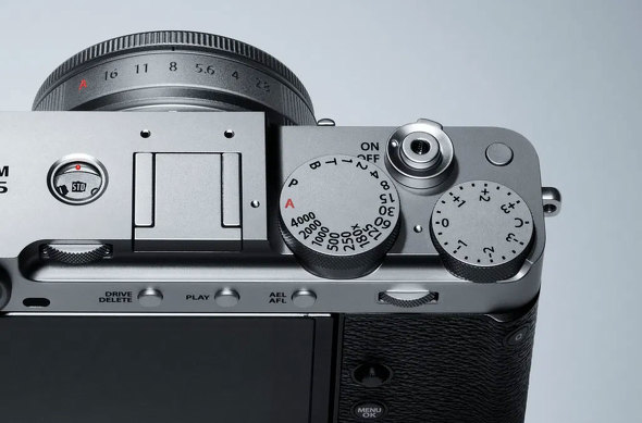 Xシリーズで初めて、アルミ削り出し加工で成形した軍艦部を採用し、天面に窓付きのフィルムシミュレーションダイヤルを配置。ダイヤルのFS1からFS3の3カ所に、全20種類のフィルムシミュレーションと画質設定から任意の項目を登録できる。3.0型104万ドットのチルト式背面液晶モニターを搭載し、180度上方向に反転することで、セルフィー撮影に対応する。