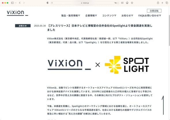 HOYAからスピンアウトしたViXionが29日からクラウドファンディングを始めた。新製品の“オートフォーカスアイウェア”こと「ViXion01」だ。