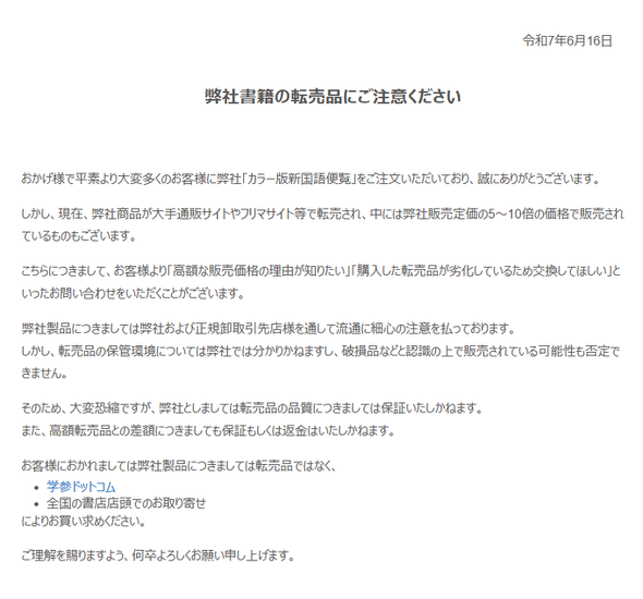 出版社の第一学習社が「カラー版 新国語便覧」について、フリマサイトなどで転売が相次いでいるとして注意喚起した。中には定価の5〜10倍の価格で転売されている場合もあるという。