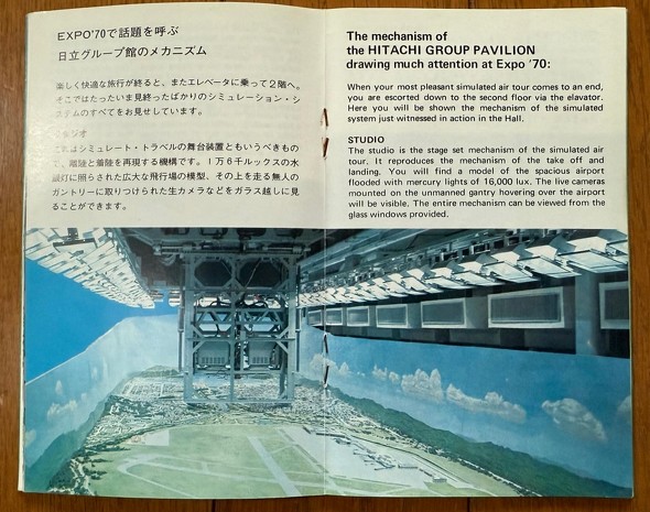 中でも感動し足しげく通ったのは、日立グループパビリオンのフライトシミュレーターです。アダムスキー型空飛ぶ円盤のような形状をした建造物のなかに、ユーザー自身で旅客機の操縦体験が可能な出展がなされていました。とはいえ、現在のCGを利用したシミュレーターではなく、巨大なミニチュア模型の空港の上をクレーンで吊されたカメラが移動するというリアルな仕組みでした。
