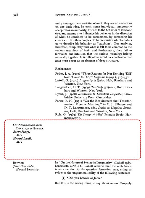 Robert Fiengo & Howard Lasnik. “On nonrecoverable deletion in syntax”. Linguistic Inquiry, 1972; 3(4)528.