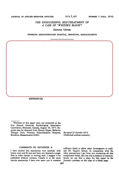 Dennis Upper. “The unsuccessful self-treatment of a case of “writer's block””. Journal of Applied Behavior Analysis, 1974; 7(3)497. DOI: 10.1901/jaba.1974.7-497a