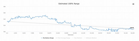 「TeslaFi」というログサービス上では、納車時との比較で劣化率4.43%という結果です。一方、「Tessie」というアプリでは、劣化率15.02%とあります。双方で10ポイント程度の開きがあり、どちらを信じていいのかわかりません。とりあえず、間を取って、約1割減としておきましょう。