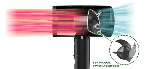 吹き出し口の先端内側には、ゴルフボールの表面にあるようなディンプル(くぼみ)を施して空気の抵抗を抑えた。風量は毎分4.8m3。