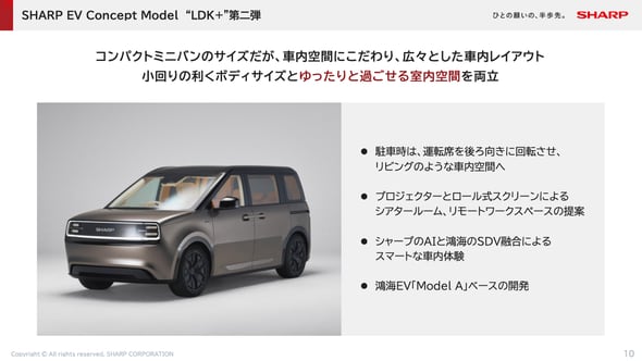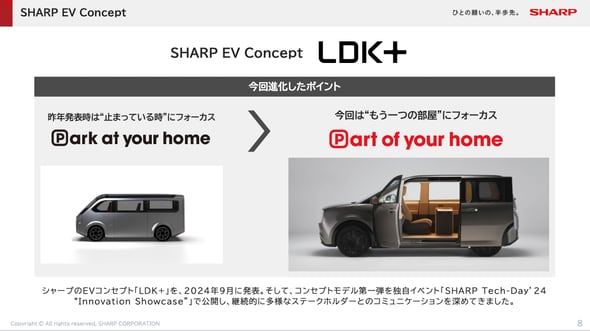 シャープは10月24日、2027年度に電気自動車(EV)市場に参入すると発表した。24年に発表した「LDK+」コンセプトを進化させた第二弾モデルを30日に開幕する「Japan Mobility Show 2025」で公開する予定で、これをベースにした製品の発売を目指す。