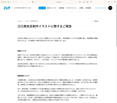 メガネ専門店「Zoff」を運営するインターメスティックは10月24日、漫画家でイラストレーターの江口寿史氏が制作したキャンペーン向けイラスト4点についての調査結果を報告した。2点は雑誌のから許諾を得ないまま参考にしていた。