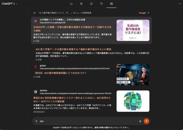 ChatGPT Atlasは、一見するとWeb上で利用できるChatGPTと同じように見えるが、実際には3つのモードがある。新規タブを開いて最初に現れるのが、「ブラウジングモード」だ。ここで調べたい事柄を入力すると、AIによる回答とともに、検索によって得られたページが表示される。検索によって得られたページは、一番上のアイコン、「検索する」「画像」「動画」「ニュース」のタブによって分類されている。基本的にはこのモードが標準状態である。