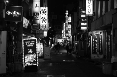 フィルムシミュレーションといえばモノクロのACROSは欠かせないよねってことで、夜の街をACROSで。マニュアル露出でシャッタースピードを1/30秒にして撮影(13-33mm 33mm 1/30びょう F6.3 -1 ISO800)