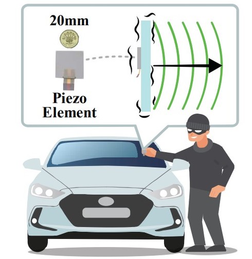 研究チームが開発した「ShieldSpear」と呼ばれる攻撃システムは、35(縦)×35(横)mmのコインサイズ(15mmの厚さ)の圧電素子を使用する。この素子をフロントガラスの外側に貼り付けることで、ガラス全体を巨大なスピーカーとマイクに変換する仕組みだ。圧電効果により、電圧を加えると素子が変形してガラスを振動させ、逆に音波によるガラスの振動を電気信号としても検出できる。
