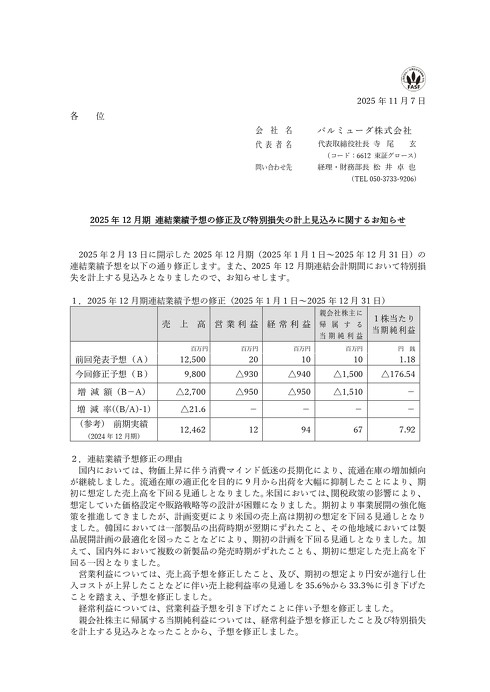 バルミューダは11月7日、2025年12月期(1月1日〜12月31日)の連結業績予想を修正すると発表した。売上高は125億円から98億円、営業利益は2000万円の黒字から9億3000万円の赤字、純利益は1000万円の黒字から15億円の赤字にそれぞれ下方修正する。併せて、全社的な事業効率の改善のため、5億6000万円の特別損失も計上している。