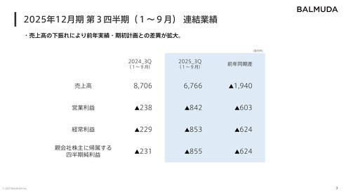 バルミューダが同日に発表した25年12月期第3四半期の連結業績(1月1日〜9月30日)は、売上高は67億6600万円(前年同期は87億600万円)、営業利益は8億4200万円の赤字(同2億3800万円の赤字)、純利益は8億5500万円の赤字(同2億3100万円の赤字)で、減収減益となった。