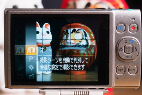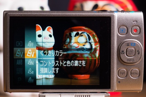 Pモードにすると、「マイカラー」を選んだり露出補正をしたり、AFを中央一点にしたりマクロモードにしたり、それなりにコントロール可能になる。