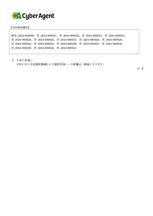 サイバーエージェントは、特許権侵害に関する訴訟によって特別損失として7億2700万円を計上したと発表した。