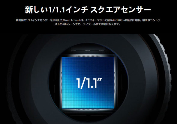 「OSMO Action」シリーズも今回で4代目となった。ただし見た目もサイズも重さも先代と同じ。ただ、レンズ部をよく見ると「1/1.3"」と書いてある。