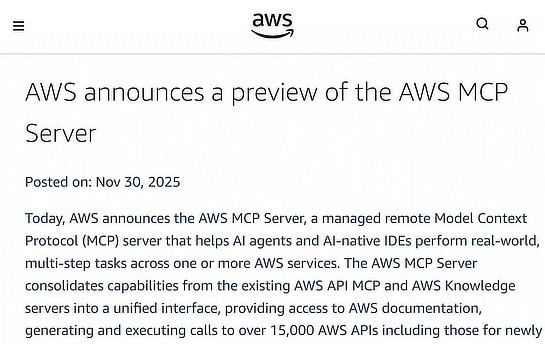 この記事は新野淳一氏のブログ「Publickey」に掲載された「「AWS MCP Server」プレビュー開始。最新のAWS APIからナレッジベースまで包括的にAIからAWSを利用可能に」(2025年12月1日掲載)を、ITmedia NEWS編集部で一部編集し、転載したものです。