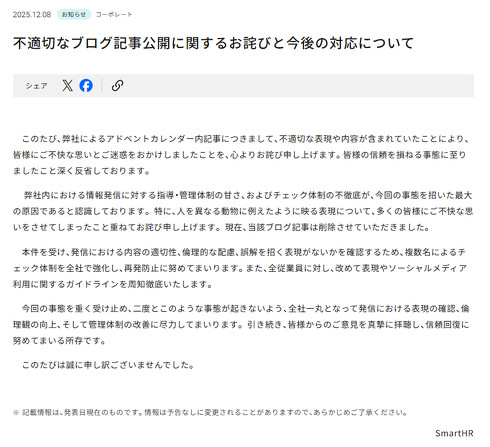 このような意見を受け、SmartHRは8日、問題の記事の内容を削除。「皆さまの信頼を損ねる事態に至りましたこと深く反省しております」「人を異なる動物に例えたように映る表現について、多くの皆さまにご不快な思いをさせてしまったこと重ねておわび申し上げます」などと謝罪した。