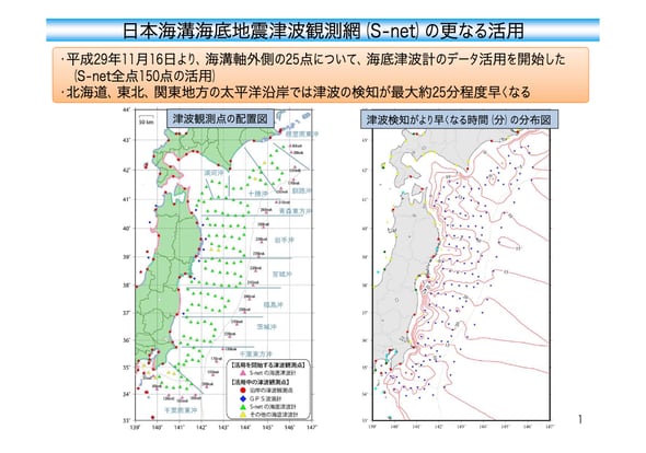 S-netにより、地震や津波を観測できる範囲は沿岸から200kmも延長された。なにより、沖合で地震が発生した場合には、より震源に近い場所で地震や津波をリアルタイムに捉えることが可能になった。気象庁の資料によると「北海道、東北、関東地方の太平洋沿岸では津波の検知が最大で約25分程度早くなる」という。