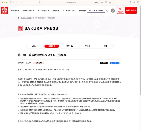 サクラクレパスは9日、スペインで開催されたイベント「Manga Barcelona」で使用した販促ポスターに参加者の一部から「生成AIで作ったものではないか」と疑問が投げかけられた件で、公式見解を発表した。