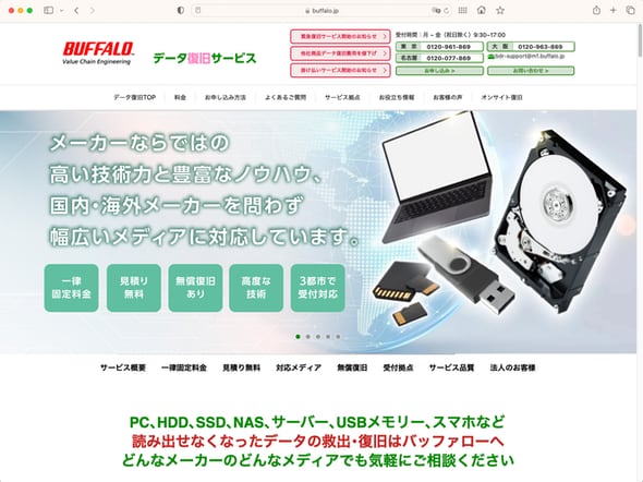 データ復旧サービスは、読み出せなくなったPCやNAS、スマートフォンなどのデータを復旧するサービス。被災したバッファロー製品の他、他社製品も受け付ける。なお、個人のデータ限定で、法人は対象外となる。