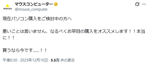 悪いことは言いません、なるべくお早目の購入をオススメします!!本当に!!──マウスコンピューターは12月10日、PC購入を検討する人たちに向け、公式Xアカウント(@mouse_computer)でこう呼びかけた。PC市場を巡っては昨今、AIへの需要増によりメモリの値上がりと品薄状態が深刻化している。マウスコンピューターの投稿も、その影響を受けてのものとみられる。