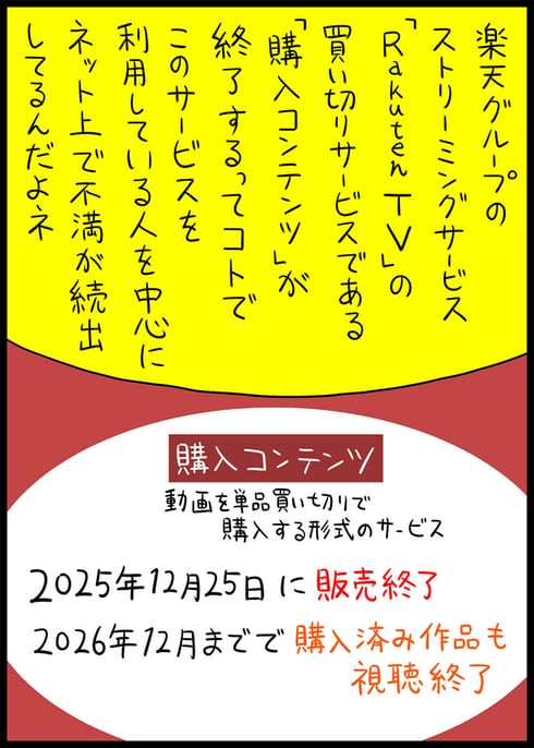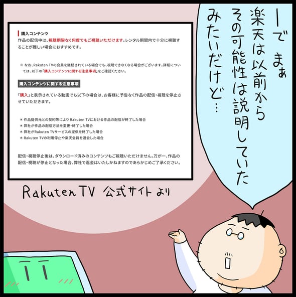連載 2025年12月14日 Rakuten TVの「購入コンテンツ問題」が業界的にかなりまずいと思う理由をマンガ家が解説:サダタローのゆるっとマンガ劇場(2/6 ページ) 「Rakuten TV」が12月1日に発表したサービスの変更内容が物議を醸しています。ただ、ネットの反応を見ていて個人的に気になったのは、電子書籍などにおいても同様のことが起こるのではないか? という不安の声でした。 [サダタロー,ITmedia] PC用表示 関連情報 Share Tweet LINE Hatena 前のページへ | 次のページへ どんな配慮が欠けている? Copyright © ITmedia, Inc. All Rights Reserved. 前のページへ | 次のページへ