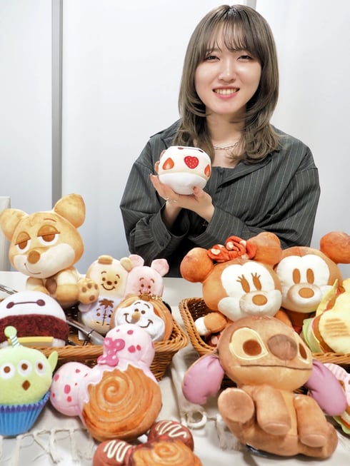 タカラトミーアーツ「Nuiパン」を入社1年目に企画し担当したプロダクト企画部の伊藤美空さんと「Nuiパン」たち。手に持っているのは一番のお気に入りというベイマックスをモチーフにした「マリトッツォ」(Sサイズ、2200円)©Disney