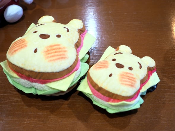 第1弾で大人気となったくまのプーさんモチーフの「サンドウィッチ」(左:Sサイズ、2420円、右:チェーンストラップマスコット、1980円)。中の具はプーさんの物語の舞台にもなっている100エーカーの森で取れた野菜などをイメージしている。具によって布の素材を変えて作った野心作で、試作品が上がってきたとき、伊藤さんは「ここまで出来るんだ」と驚いたという