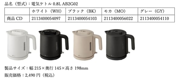 対象は「電気ケトル 0.8L AB2G02」のうち、2025年12月15日から今年1月31日までの期間に販売した商品の一部。本体カラーと「商品CD」と呼ばれる番号が、ホワイトの「2113400054097」、ブラックの「2113400054103」、モカの「2113400056022」、グレーの「2113400054110」のものとなっている。商品名や商品CDは、製品底面の銘板シールで確認できる。