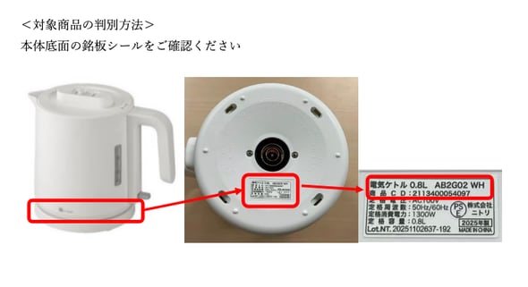 ニトリは2月19日、電気ケトルの一部製品に不具合があったと公表した。ふたが完全に閉まっていない状態で使用した場合、湯沸かし時に電源が自動オフにならず、結果として、ごくまれに本体底面が外れたり、ふたが飛んで熱湯が吹き出したりするおそれがあるという。