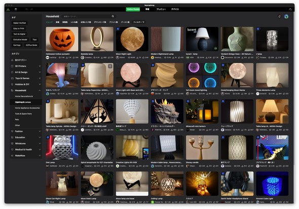 データはフィギュアなど造形物も多いが、ホームアプライアンスなどの雑貨やライトシェードなど、実用品も多く揃っている。まるでホームセンターをオンラインで見ているようだ。