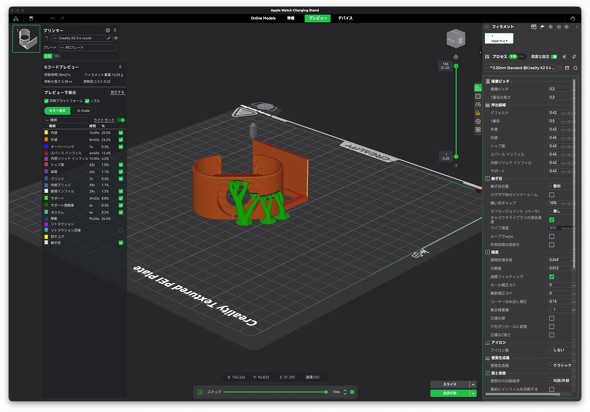 出力するには、まずスライスという処理が必要だ。3Dプリンターは少しずつ積層しながら立体物を作るので、3Dデータを横方向にスライスしてプリンターを制御する「G-code」データに変換する必要がある。またこの時に、中空構造などがあった場合には、それを支えるための仮の支柱が必要になる。こうした支柱の設計や付加も、スライス時に自動的に作成してくれる。