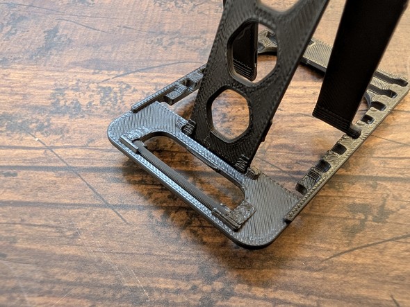 スマホスタンドも、造形としては面白い。しまう時は平たく折りたためるというスタンドは世の中にたくさんあるが、このデータは平面の板として出力される。