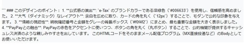 1. **公式感の演出**: `e-Tax` のブランドカラーである深緑色(`#006633`)を使用し、信頼感を高めました。 2. **大气(ダイナミック)なレイアウト**: 余白を広めに取り、カードの角を丸く(`12px`)することで、モダンで公的な印象を与えます。 3. **情報の視認性**: 納税確認番号と金額をグレーの背景ボックス(`#f0f4f2`)にまとめ、最も重要な金額を大きく表示しました。 4. **PayPayとの融合**: PayPayの赤色をアクセントに使いつつ、ボタンの角を丸く(丸ボタン)することで、公的機関が提供するキャッシュレス決済のような親しみやすさを出しています。 このHTMLコードをそのままメール配信プログラムのBodyとしてお使いいただけます。