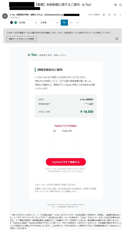 メールには「PayPayで今すぐ納税する」という文言の外部リンクも。QRコードも添えていたようだが、こちらはデータが崩れているようで正しく表示されなかった。ここまでは典型的なフィッシングメールの内容といえるが、メールの下部には「このデザインのポイント」と称した以下の内容も記載されていた。