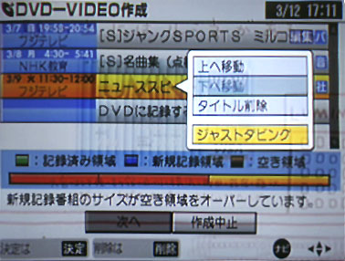 書き込みで便利なのが、ジャストダビング機能で、ディスクの残量に合わせて、書き込みを選択したファイルがぴったり収まるように自動的にビットレートを設定することが可能だ。もちろん、手動でのビットレート設定にも対応しているが、普段HDDに録画する時には高画質で保存しておいて、そのままジャストダビングで書き込めば、自動的に画質を最大限に保ったままDVDに収められる。書き込みの際にあれこれ悩まず、さくさく作業できるので、ものぐさな人にはうってつけの機能といえるだろう。