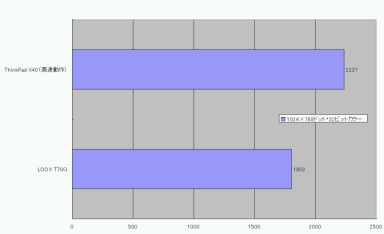 PCMark04の結果を見ると、フル稼働の状態でCPUとMemoryの結果は良好だが、GraphicsとHDDの値は下回っている。ただし、CPUの結果はほぼ互角と一定いいだろう。CPUも同じクロックで動作しているのでそれほど違いはない。Memoryの値がいいのは、LOOXがPC2100の256Mバイト搭載なのに対して、X40がPC2700を512Mバイト搭載しているのが影響している。