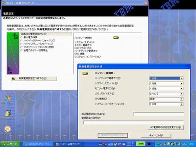 ThinkPad X40にはパワーマネジメントツールとして使用電源にあわせてCPU速度や各デバイスのパワーダウンタイムを設定するウィザードが用意されている。ここでプリセットしたモードを、ユーザーがタスクトレイのアイコンをクリックして切り替える。CPUの速度は「高速」(動作クロック1GHz)と「低速」(動作クロック600MHz)の固定設定と、「自動」の可変設定の3種類が選択できる