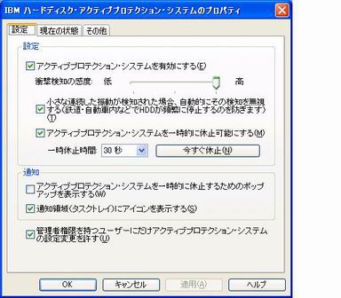ThinkPad X40でサポートされた「IBM ハードディスク・アクティブプロテクション・システム」の設定ツール。この機能は落下した衝撃を感知してハードディスクの物理的破壊を防ぐもの。ただし、衝撃設定が鋭敏で乗り物の揺れで動作しないように、検知する衝撃の強さを設定したり、乗り物特有の揺れを無視するようにこのツールで設定できる