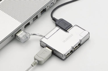 U2H-F4Sは本体サイズ58.5(幅)×47(奥行き)×12(高さ)ミリ、アップストリーム用のコネクタをダウンストリームポートに差し込んで収納できるコンパクトさが特徴。また、バスパワーでも動作するため、モバイル用途にも適する。セルフパワー用のACアダプタも付属される。