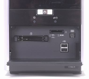インタフェースは、フロントカバー内にUSBやIEEE1394、PCカード/メモリカードスロットなど、頻繁に利用するものを装備。背面には、シリアルやパラレルといったレガシーインタフェースからTVチューナーカード用の各端子、光デジタルオーディオ出力端子などが用意されている。デジタル放送用のチューナーカードには、映像出力端子(コンポジットおよびS端子)も搭載されているので、受信映像をテレビの画面へ出力することもできる。