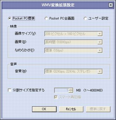 また、WMV形式への変換機能もあり、PocketPCでの再生に合わせた変換やビットレートなどを任意に指定してファイルを書き出すこともできる。WMV形式へ変換したデータはファイルサイズも大幅に小さくなるので、メモリーカードなどを介してPocketPCなどへ移せば、PCで録画した番組を移動中や外出先でエアチェックするといった使い方もできる。