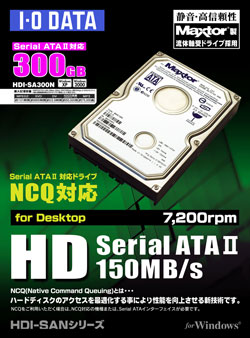 3製品は、Serial ATA IIのディスクアクセス最適化技術「NCQ(Native Command Queuing)」に対応する。採用ユニットはディスク回転速度7200rpmのMaxtor製流体軸受けドライブで、16Mバイト(HDI-SA200Nは8Mバイト)の大容量キャッシュを搭載した。