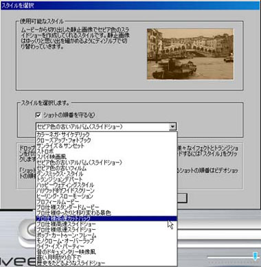ポイントは「スタイル」だ。これはいわばテンプレートで、muveeには「プロ使用スタンダード」、「ハッピーウェディングスタイル」、「セピア色の古いアルバム」など、24種類のスタイルが用意されている。また、選択されたクリップ類の順番を守るように指定することも、ランダムにすることもできる。