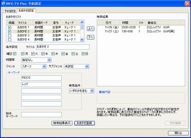 INFO.TV Plusでは、手動による録画予約のほか、番組のジャンルやキーワードなどを使った「おまかせ録画」機能もサポートしている。ここでキーワードを設定しておくだけで、条件に合致する番組はすべて自動的に録画してくれる便利機能だ。複数の設定条件を管理することが可能なだけでなく、それぞれをオンオフすることもできる。