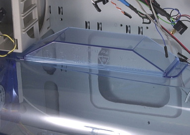 サイドカバーを外すと、真っ先に目にはいるのが透明なダクトである。SilverStoneのSST-TJ06と同じように前方から外気を吸い込み、背面へ熱気を排出する仕組みだ。このような位置にCPUを持ってくるためには、マザーボードを通常とは逆の向きで収納する必要がある。っというわけで、拡張スロットが上に、I/Oパネルが下に来ていたのだ。このあたりの構造もSST-TJ06とまったく同じである。