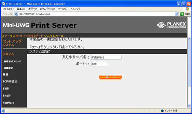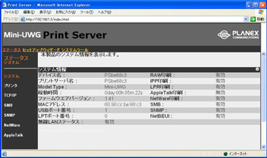 プリントマネージャが利用できない環境やMacからMini-UWGを設定する場合は、Webブラウザを使用する。Webブラウザのアドレス欄にMini-UWGのIPアドレスを入力してEnter/returnキーを押すと、Mini-UWGの設定画面が表示される。こちらにもセットアップウィザードが用意されており、順に入力していくだけで設定が完了する。そのほかステータスなども確認できる。