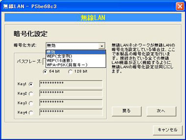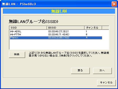 インフラストラクチャモードを選択した場合は、次に接続するアクセスポイントを指定する。手動設定のほかに自動検索機能も用意されており、検出されたアクセスポイントのSSID(名前)を選択するだけで設定可能だ。第3者に無断接続されたり、通信内容を傍受・解読されないようにアクセスポイントにセキュリティ対策を施している場合は、さらに暗号化方式やパスフレーズ(ネットワークキー)などを入力する。