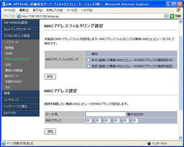 不正アクセスの防止には、SSIDの隠蔽やMACアドレスフィルタリングなどが有効だ。SSIDの隠蔽をオンにするとSSIDが検出されなくなるため、不正アクセスのターゲットになりにくくなる。MACアドレスフィルタリングを設定しておけば、登録したMACアドレス以外の無線LANクライアントからの接続を拒否することが可能だ。また、AP-54SAGはIEEE 802.11a/b/g対応製品だが、例えば接続する無線LANクライアントに802.11a対応製品がない場合、802.11aの使用を停止しておくと不正アクセスの危険性が減る。