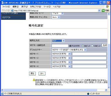 通信内容の傍受・解読や不正アクセスを防止するための暗号化/ユーザー認証方式では、WEP、IEEE 802.1x、WPA、WPA-PSKの4種類が設定できる。WEPは64/128/152ビットのWEPキーに対応する。少なくともWEPキーを設定して通信データを暗号化し、可能ならより安全性の高い設定を施すようにしよう。